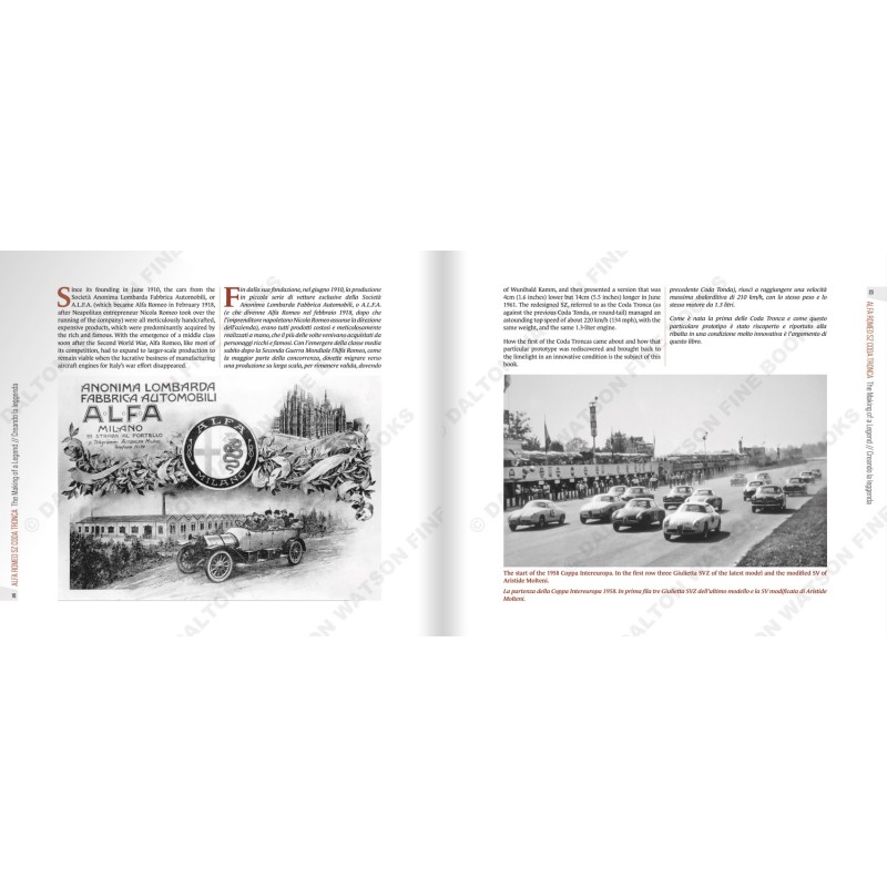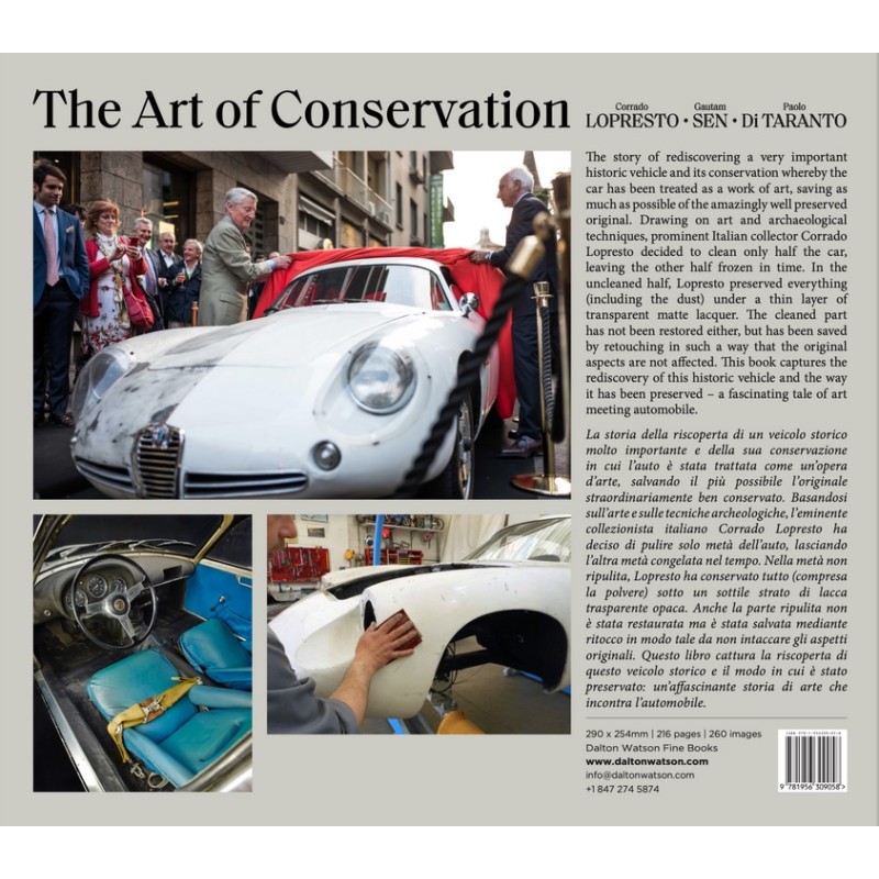 The story of rediscovering a very important historic vehicle and its conservation whereby the car has been treated as a work of art, saving as much as possible of the amazingly well preserved original. Drawing on art and archaeological techniques, prominent Italian collector Corrado Lopresto decided to clean only half the car, leaving the other half frozen in time. In the uncleaned half, Lopresto preserved everything (including the dust) under a thin layer of transparent matt lacquer. The cleaned part has not been restored either, but has been saved by retouching in such a way that the original aspects are not affected. This book "Alfa Romeo SZ Coda Tronca: The Art of Conservation" captures the rediscovery of this historic vehicle and the way it has been preserved – a fascinating tale of art meeting automobile.