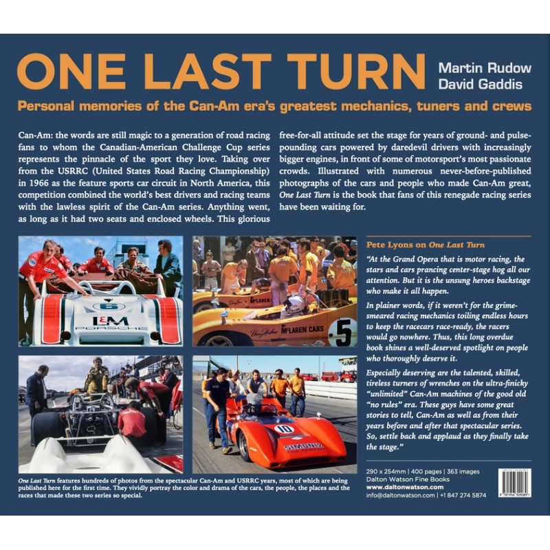 Years later the names still carry weight: drivers like Dennis Hulme, Bruce McLaren, Dan Gurney, Jackie Stewart, Mark Donohue and George Follmer. And the cars: McLaren, Lola, Porsche, Ferrari and Shadow. But who was behind those awesome machines and drivers? Who could keep them going when the torque shook loose engine bolts? Who could spend an entire low-paid off-season in small, cold, and drafty race shops looking for an extra edge in performance and reliability? Who could toil in uncomplaining anonymity behind the scenes while the cars and their drivers basked in the considerable glory that went with Can-Am racing? The men portrayed in One Last Turn.