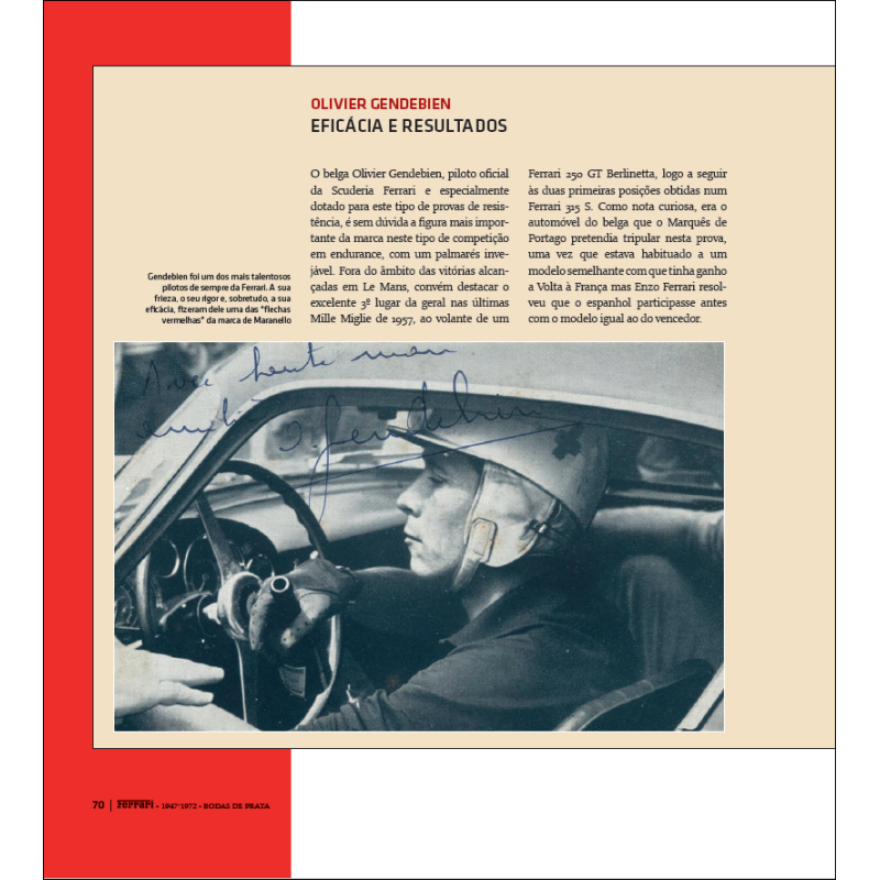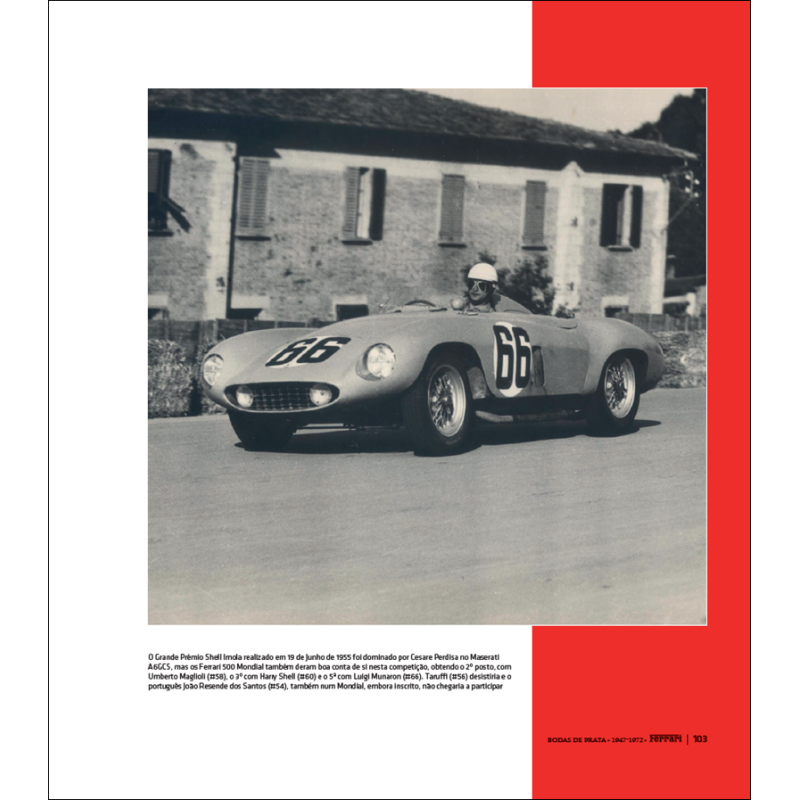 Reference : LN06009The main objective of this book is to describe the first 25 years of success and victories of the Ferrari brand in racing, in a period that goes from its foundation in 1947, until 1972. In Portugal the Ferrari brand, during the fifties and sixties, was the winner of numerous races organized on Portuguese soil, not only by foreigners, but also by Portuguese drivers, on famous circuits such as Boavista (Porto), Vila Real, Monsanto and Montes Claros (Lisbon), Cascais and Vila do Conde.