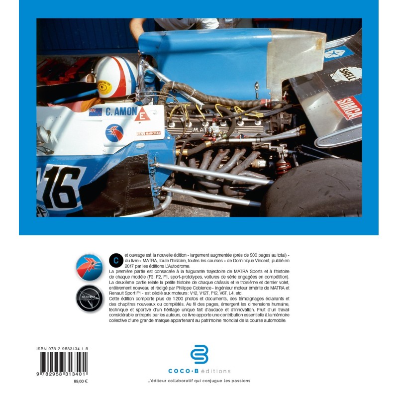 Cet ouvrage est la nouvelle édition - largement augmentée (près de 500 pages au total) - du livre "MATRA, toute l’histoire, toutes les courses" de Dominique Vincent, publié en 2017 par les éditions L’Autodrome. La première partie est consacrée à la fulgurante trajectoire de MATRA Sports et à l’histoire de chaque modèle (F3, F2, F1, sport-prototypes, voitures de série engagées en compétition). La deuxième partie relate la petite histoire de chaque châssis et le troisième et dernier volet, entièrement nouveau et rédigé par Philippe Coblence - ingénieur moteur émérite de MATRA et Renault Sport F1 - est dédié aux moteurs : V12, V12T, F12, V6T, U8, L4, etc.