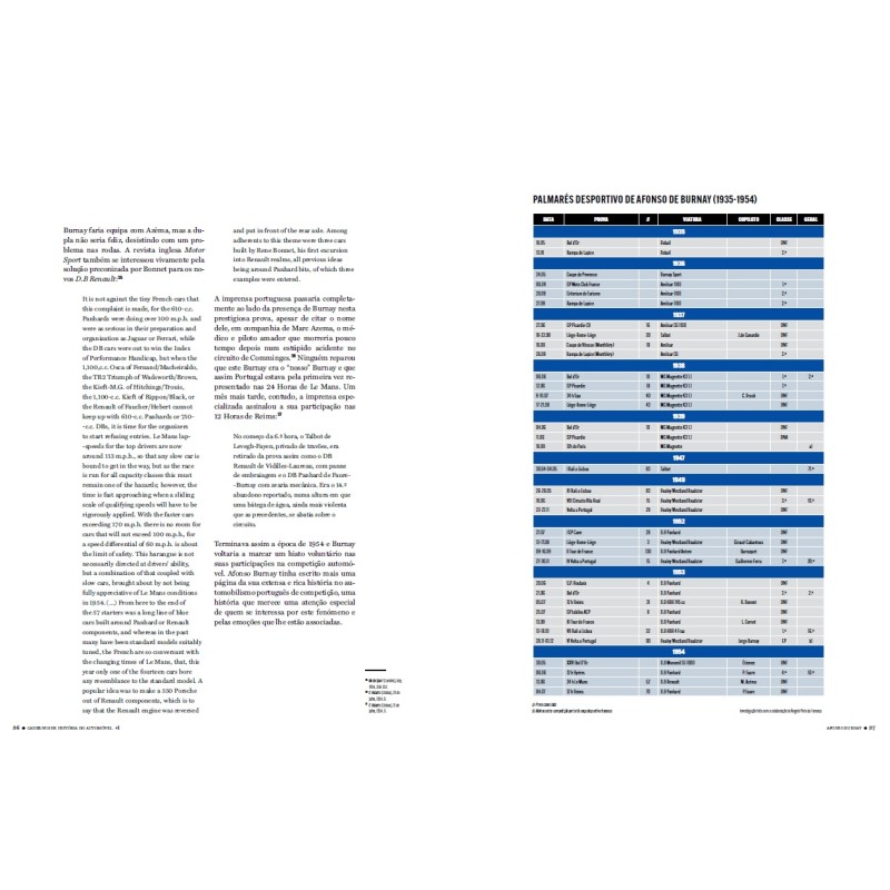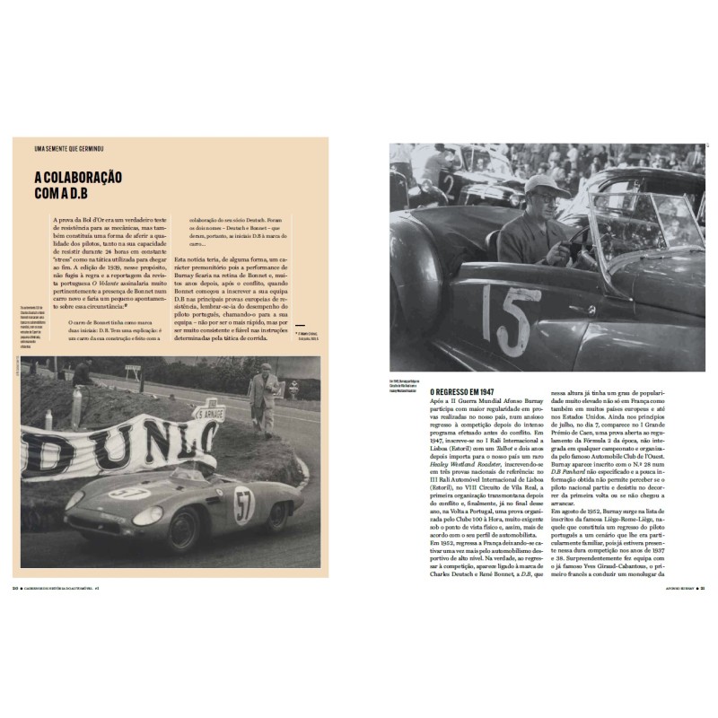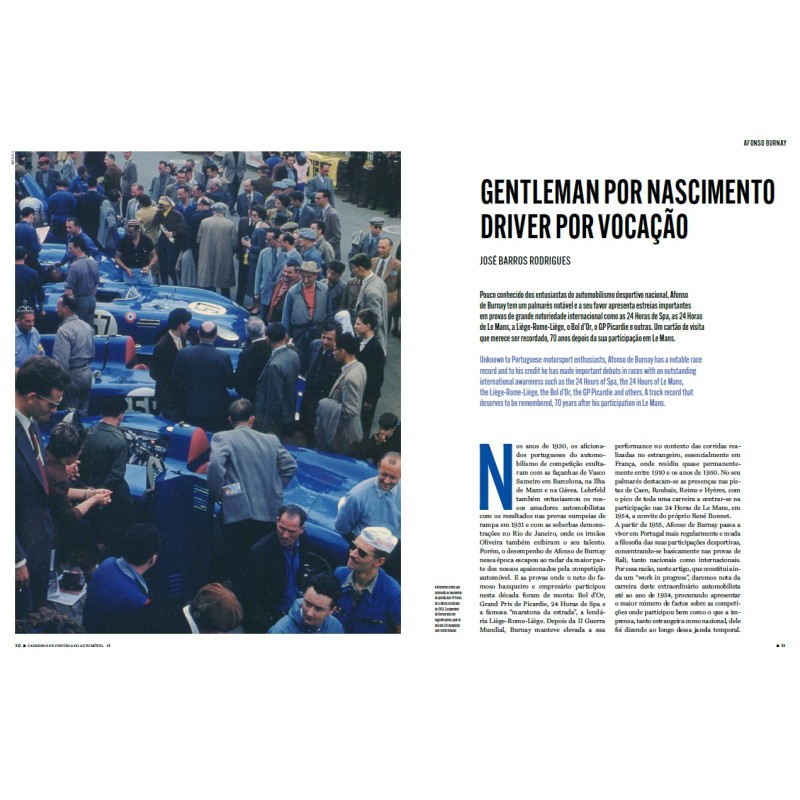 Nesta estreia, abordamos a figura de Afonso de Burnay, um piloto amador extraodionário que esteve envolvido num numero particularmente elevado de provas relevantes - 24 horas de Le Mans, 24 Horas de SPA, Liège-Rome-Liège e Bol d'Or, entre outras.