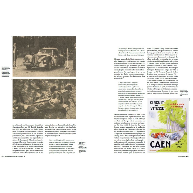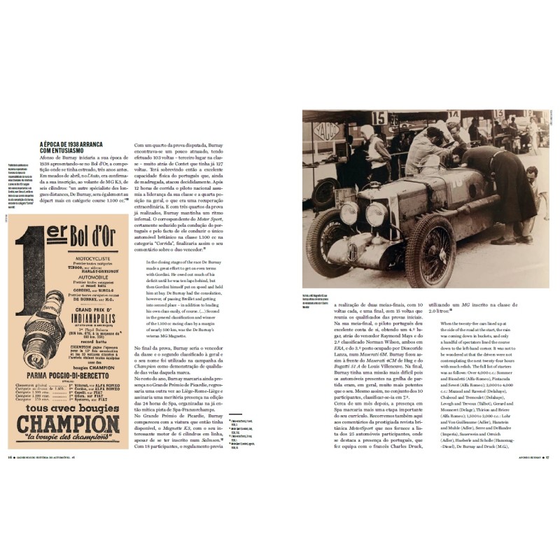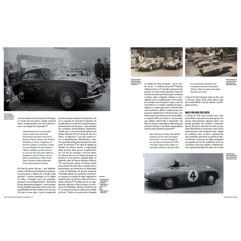 A História do Automóvel em Portugal ainda tem muitos assuntos que merecem estudo detalhado, quer na busca de novas fontes, quer no incremento da precisão das diferentes linhas do tempo dos acontecimentos que envolvem os diferentes temas. Nesta obra teremos sempre duas biografias: uma de um piloto português e outra versando a carreira de um piloto estrangeiro no nosso país. Nesta estreia, abordamos a figura de Afonso de Burnay, um piloto amador extraodionário que esteve envolvido num numero particularmente elevado de provas relevantes - 24 horas de Le Mans, 24 Horas de SPA, Liège-Rome-Liège e Bol d'Or, entre outras. Quanto à biografia do piloto estrangeiro, escolhemos Teddy Rayson, porque antes da II Guerra Mundial foi aquele que mais provas efectuou no nosso país, deixando um rasto de competência e de simpatia. Os Cadernos de Historia do automovel orgulham de apresentar um trabalho inédito sobre uma marca quase confidencial no nosso mercado, a Siata, um deles com um historial desportivo por excelência, numa rubrica que se manterá nas proximas edições. Os outros: Sado 550, Steyr 50, Fiat 131 ...