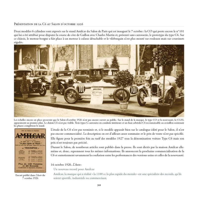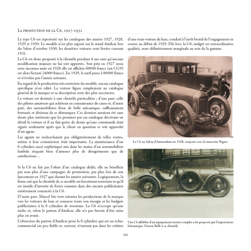 - Tome 1 : Les 6 cylindres d’usine (la genèse de la voiture, les différents modèles d’usine et leurs engagements en course par l’usine après un rappel de l’histoire de la marque et des courses en 4 cylindres). Genèse de la C6 « client ».