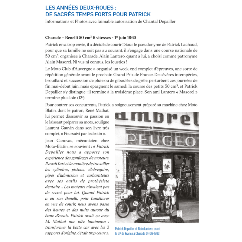 Reference : LN06148Éric Bhat est fasciné par Patrick Depailler qu’il a observé lors d’un Grand Prix à Pau. Ce dernier a débuté à moto grâce à l’aide de Jean-Pierre Beltoise et s’est rapidement imposé.