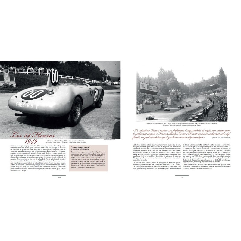 Il fallait bien trois passionnés du circuit pour raconter, par le texte et par l’image, l’histoire du ‘grand Francorchamps’ et pour sortir de l’oubli autant d’anecdotes, glanées sur et autour du circuit. Le premier tome de cette trilogie se penche sur les débuts du circuit, sur la naissance de ses épreuves mythiques, sur sa renaissance après la guerre jusqu’au moment où Francorchamps se dote enfin d’infrastructures permanentes ».