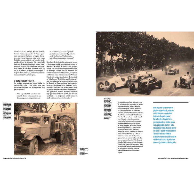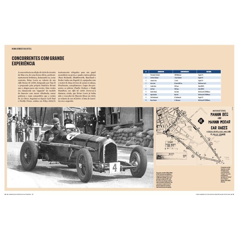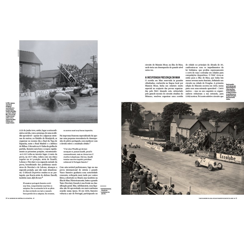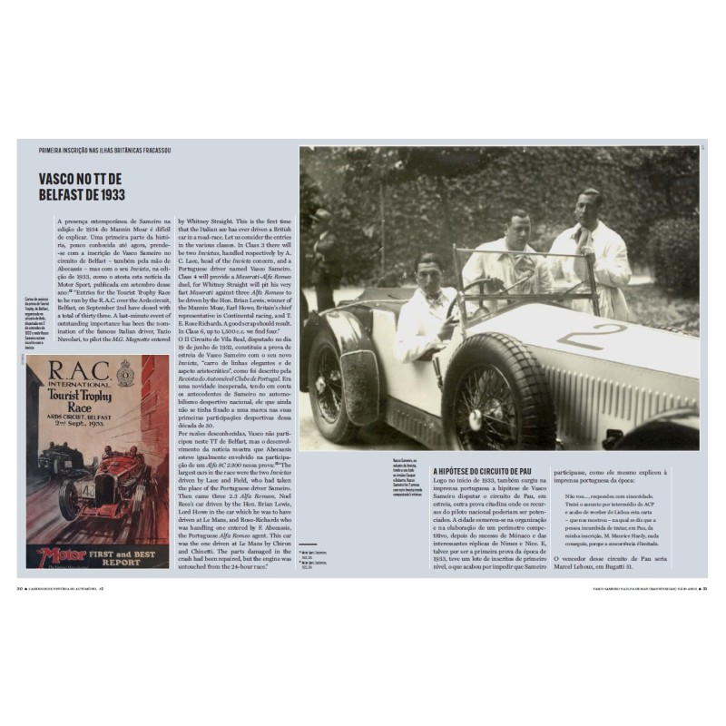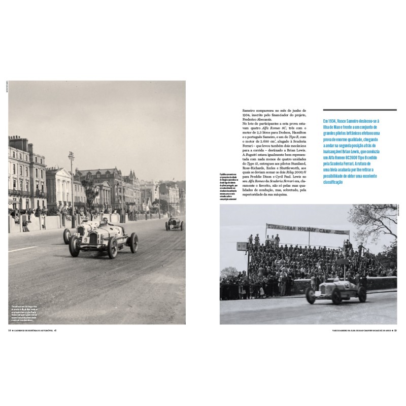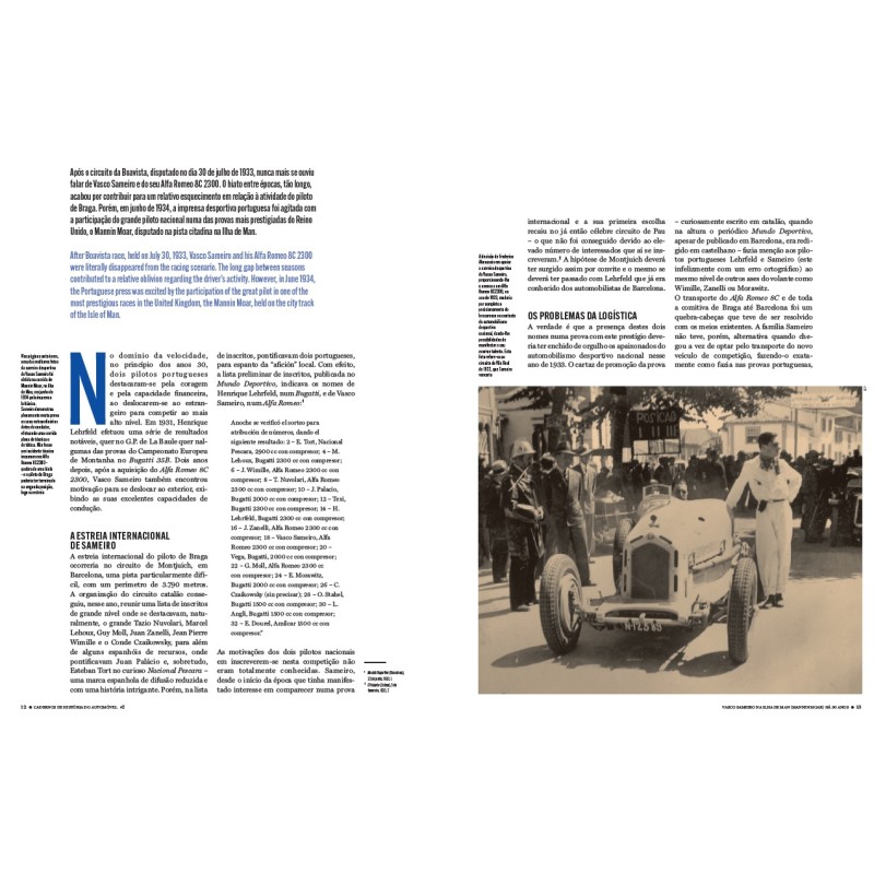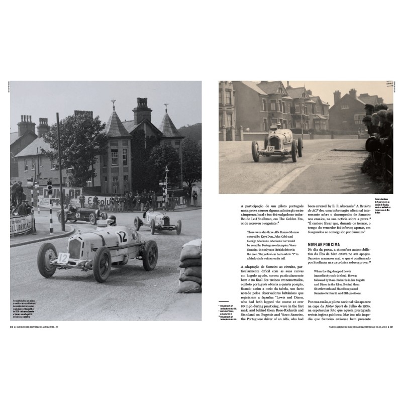 A História do Automóvel em Portugal ainda tem muitos assuntos que merecem estudo detalhado, quer na busca de novas fontes, quer no incremento da precisão das diferentes linhas do tempo dos acontecimentos que envolvem os diferentes temas. Nesta obra teremos sempre duas biografias: uma de um piloto português e outra versando a carreira de um piloto estrangeiro no nosso país. Nesta estreia, abordamos a figura de Vasco Sameiro que participou no Mannin Moar de 1934, o circuito de Douglas Ilha de Man... Quanto à biografia do piloto estrangeiro, escolhemos Stirling Moss em Portugal. Os outros: AC Bristol em Portugal, Bignan em Portugal, A Historia do Bugatti 35A 4767, Autobianchi Primula ...