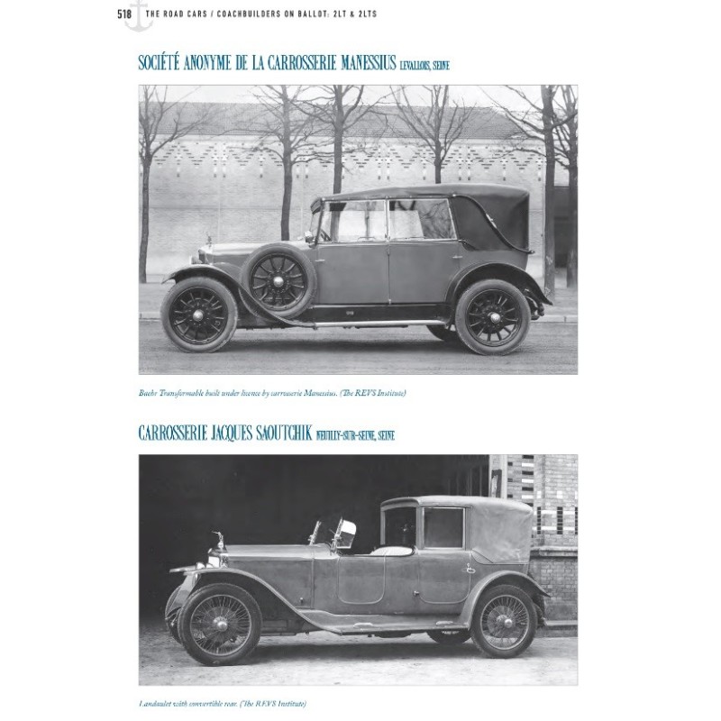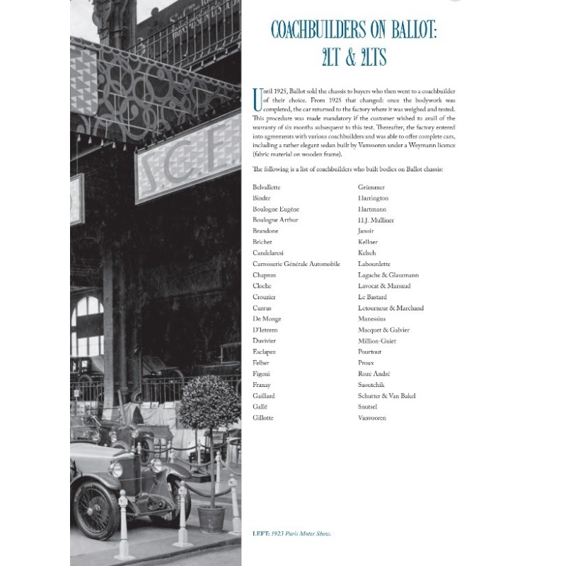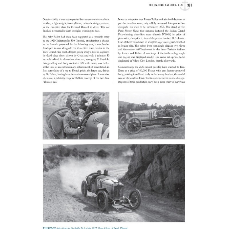 Ballot racing engines were copied by Miller, Offenhauser and Sunbeam, and inspired Duesenberg. The Ballot sports cars were an inspiration for the Bugattis, Alfa Romeos, Bentleys, Delages and other specialised, high-performance production cars that were to take the sporting world by storm in the later 1920s, and they were unarguably the ancestor of all modern sports cars, being the first to be produced in series with a twin overhead camshaft engine and four valves per cylinder. Prominent coachbuilders, from H.J. Mulliner to Figoni, clothed their sporting chassis with imaginative designs, many of which are featured in these volumes.