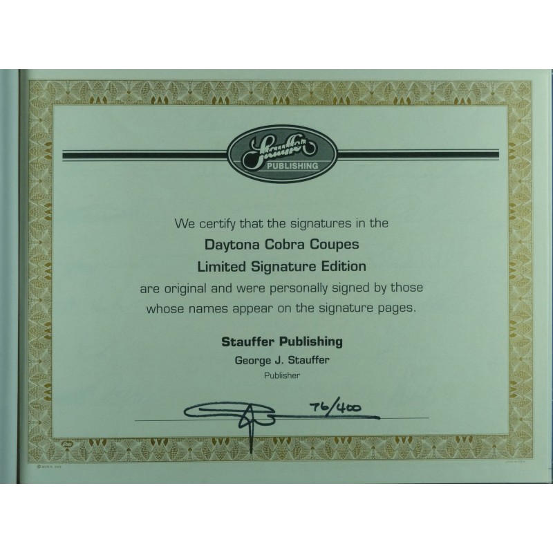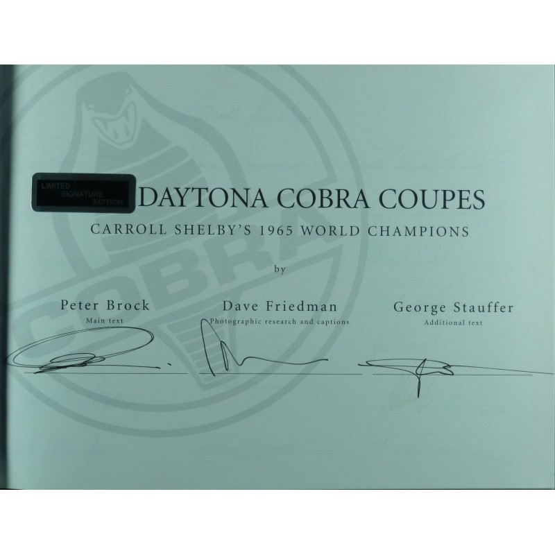 LIMITED SIGNATURE EDITION N°76/400. SIGNÉ PAR LES 3 AUTEURS, PAR LES 19 MEMBRES DE L'ÉCURIE ET PAR 22 PILOTES DE GRANDE RENOMMÉE AYANT PILOTÉ LA COBRA DAYTONA SHELBY: