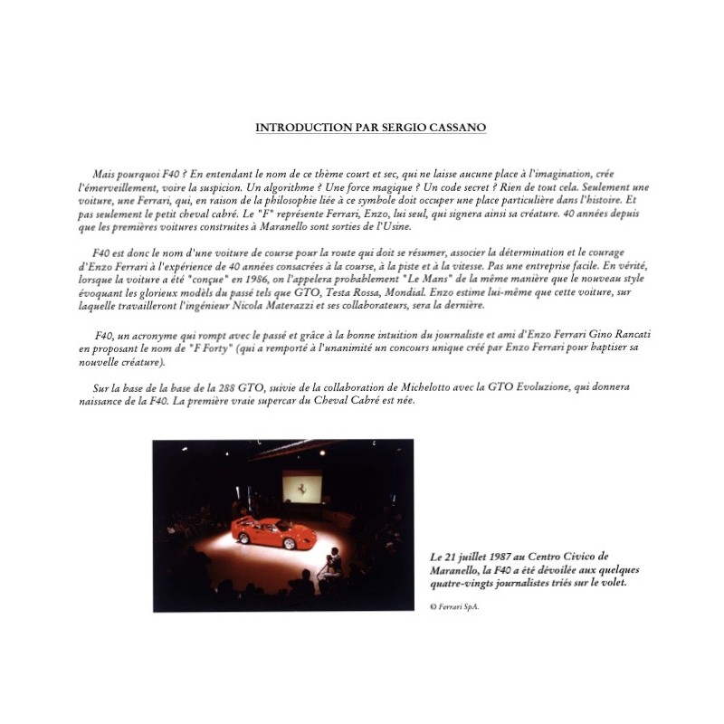 Livre réalisé par un passionné pour les passionnés de ce modèle mythique et emblématique de Ferrari. Il regorge de documents, photos et archives inédites du contexte entourant la voiture, de sa genèse à travers les professionnels qui y ont travaillé, jusqu'à quelques uns de ses propriétaires, tous nous livrent ici leurs anecdotes... Livre incontournable si on est fan de la F40 !