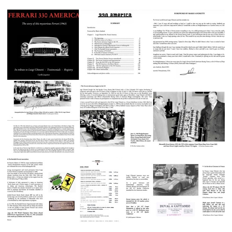 The Ferrari 330 America if it is unknown to the public, however, deserves to be a Ferrari in its own right. Often seen as the interim model between the 250 GTE and the 330 GT 2 + 2, it remains a mystery as it has a body of the 250 GTE Series III Pininfarina with a 4-liter Colombo 12-cylinder engine derived from the 400 Superamerica. Rare car because only 50 were built by Pininfarina on the initiative of Luigi Chinetti, the famous Ferrari importer located on the East Coast of the USA with his company Luigi Chinetti Motors Inc. of Manhattan, New York. This unique book is a tribute to Luigi Chinetti, the first man who was able to convince with charisma and enthusiasm Enzo Ferrari on Christmas eve 1946 to become a real car manufacturer. Ferrari's history with Chinetti will remain inseparable forever. The foreword is by the great American pilot Mario Andretti. The first part of this book is devoted to the life of Luigi Chinetti until 1964. The history of Ferraris Americas, Superamericas is told until the arrival of the 250 GTE 2 + 2 then finally the mysterious 330 America. A register of the 50 units manufactured in 1963 on more than 200 pages with testimonies from the famous Ferrari world such as Albert Obrist, Bill Noon, Bill Orth, David Wheeler, Kerry Chesbro, Paul Baber, William Edgar, Kevin Braun, Tom Yang… A complete book in English by the French Ferrari historian Cyrille Jaquinot which will be a reference in the libraries of Ferrari enthusiasts.