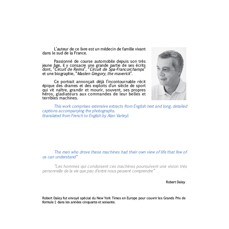 Ce portrait annonçait déjà l'incontournable récit épique des drames et des exploits d'un siècle de sport, qui vit naître, grandir et mourir, souvent, ses propres héros, gladiateurs aux commandes de leurs belles et terribles machines.