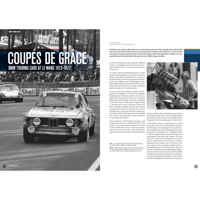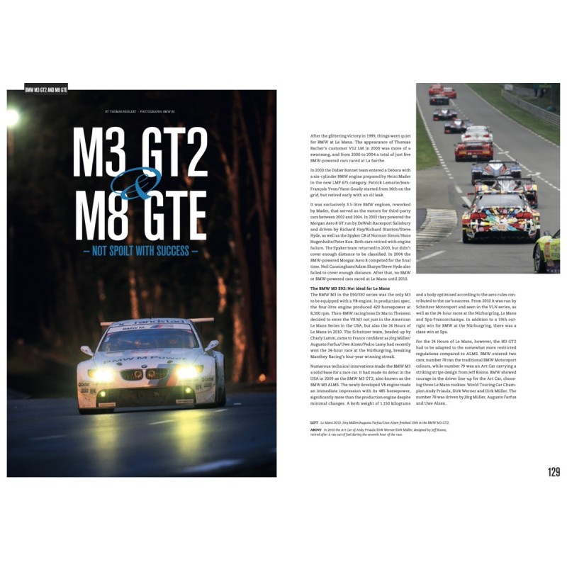 Starting off with a class win – The first two outings at Le Mans in 1937 and 1939 Coupés de grâce – BMW touring cars at Le Mans 1972–1977 Flying colours – BMW’s Art Cars at Le Mans Baptism of fire at La Sarthe – The BMW M1 at Le Mans Powered by BMW – Customer cars with BMW engines at Le Mans 1965–2016 Perfect Debut – The McLaren F1 GTR at Le Mans 1995–1998 Portrait of a Winner – The BMW V12 LM and LMR 1998 to 2000 Not spoilt with success – M3 GT2 and M8 GTE Gearing up for 2024 – BMW M Hybrid and BMW M4 GT3