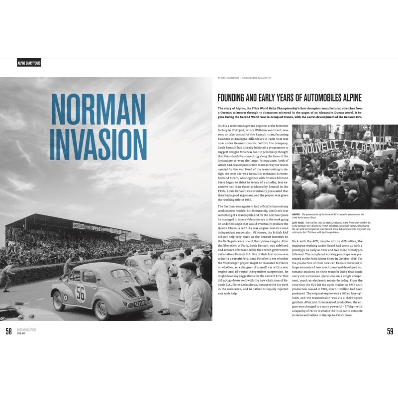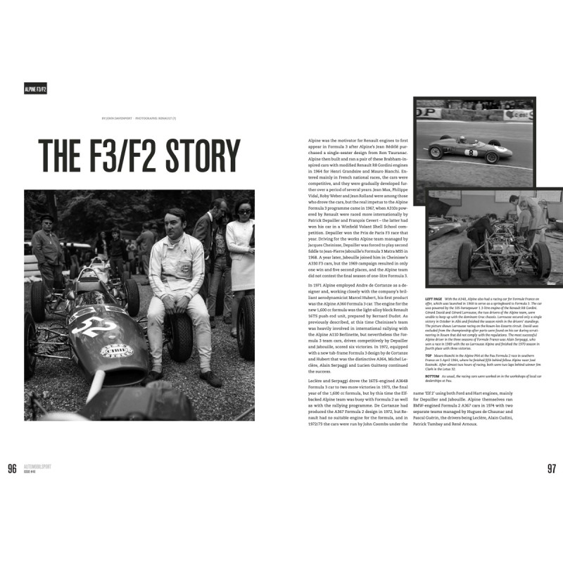 Norman Invasion – Founding and early years of Automobiles Alpine The seven Musketeers – Alpine drivers The first World Rally Champions Home win at Le Mans – Alpine in sportscar racing The F3/F2 story A level playing field – One-make Alpine series over the years Competing at World Championship-Level – Alpine in modern F1 and endurance racing
