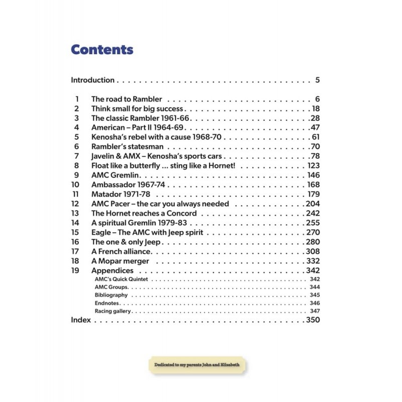 The Legend of American Motors spans the period 1954 to 1987, and covers everything from its sales and racing successes, to brand and model advertising, and its role in popular cultural. The book covers the following models, among others: Rambler (1956-60), Rambler American (1958-69), Rambler Ambassador (1958-66), Rambler Classic (1961-66), AMC Rebel (1967-70), AMC Ambassador (1967-74), AMC Javelin (1967-74), AMC Hornet (1970-77), AMC Gremlin (1970-78), AMC Matador (1971-78), AMC Pacer (1975-80), AMC Concord (1978-83), AMC Spirit (1979-83), AMC Eagle (1980-88), AMC Alliance (1983-87)