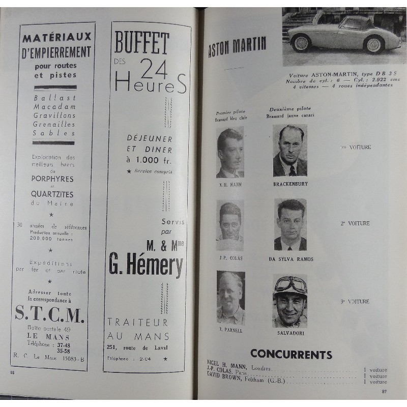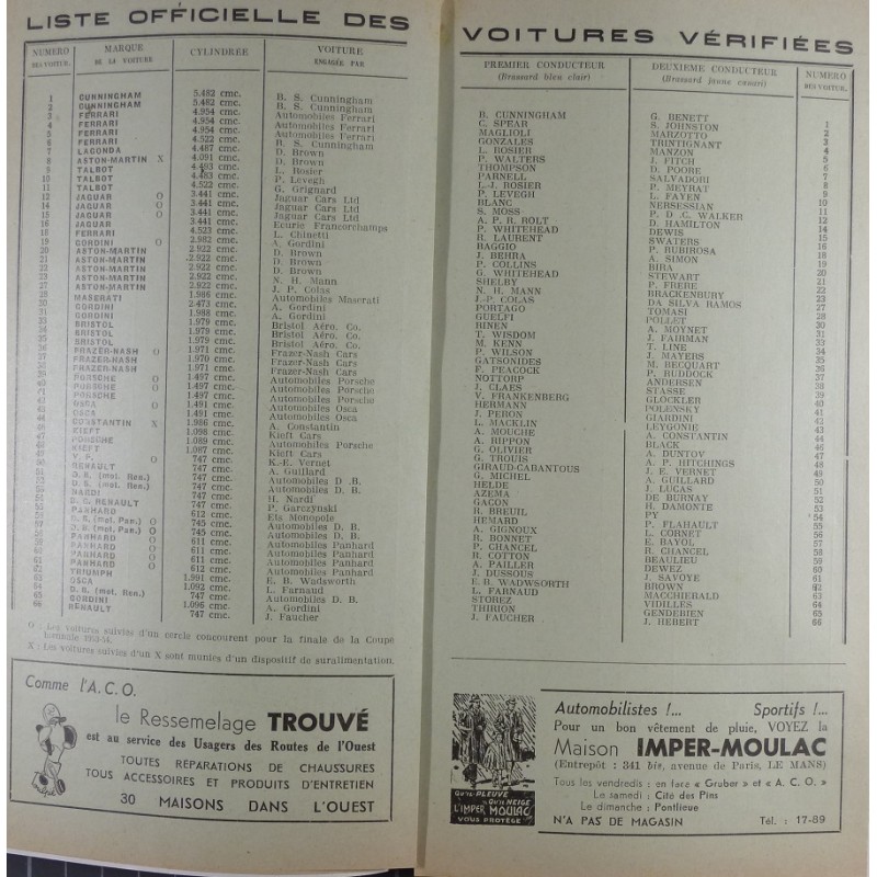 Programme officiel des 24 heures du Mans 1954. Liste des voitures vérifiées incluse. Très bon état