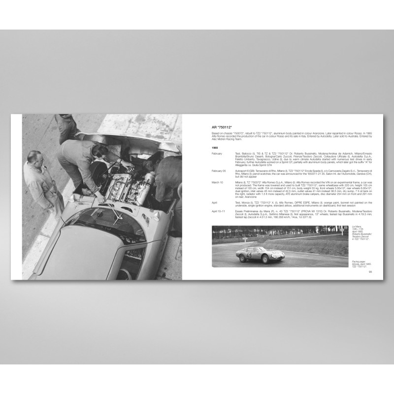 Volumes 3, 4 and 5 contain a complete registry of all Giulia TZs ever built, as well as the corresponding changes of ownership, registration numbers and race participation up to the end of homologation in 1974, insofar these can be attributed to individual cars.