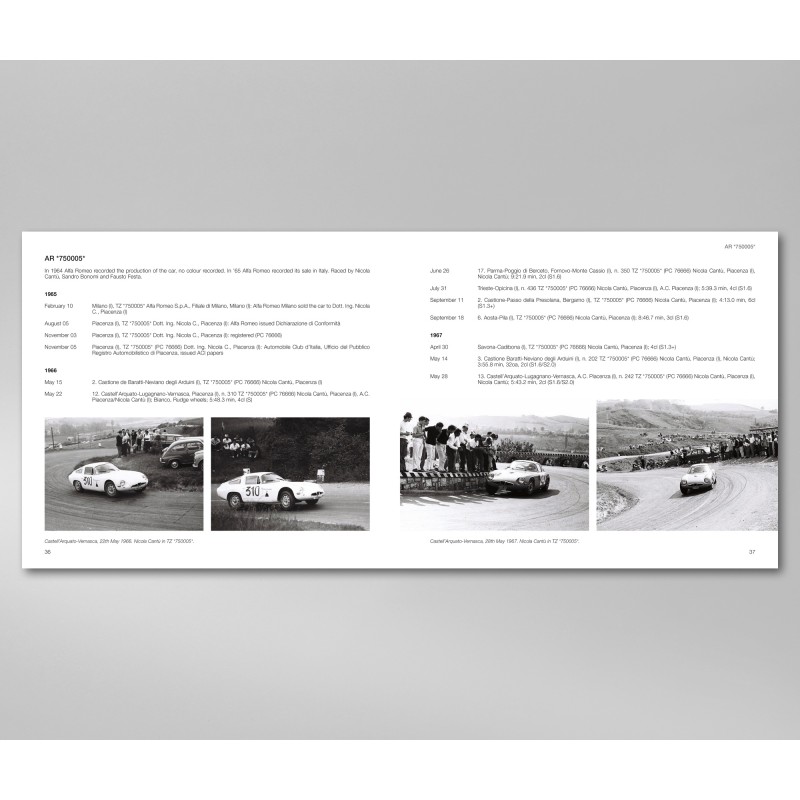 Dr. Marco Fazio, former director of the factory archives (the "Automobilismo Storico Alfa Romeo – Centro Documentazione") allowed us to examine previously unreleased documents related to the Giulia TZ; their evaluation entailed several years of work. The majority of the photographs reproduced in the book have not been previously published.