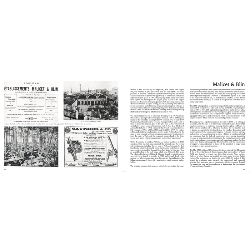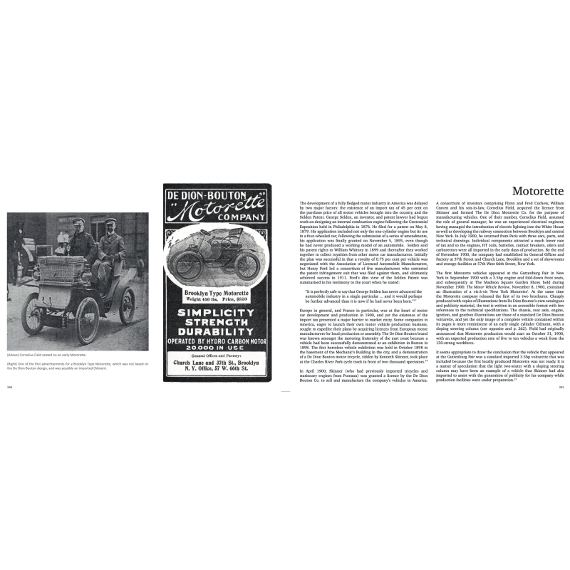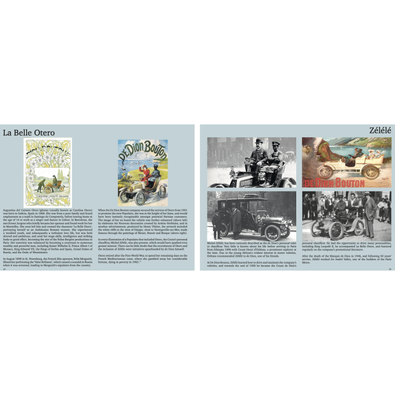 Within the 800 carefully designed pages there are more than 1,000 photographs and drawings, a comprehensive set of footnotes and a bibliography that together provide a detailed narrative of the De Dion Bouton business at the turn of the last century. An epilogue charts the pathway of the company through the war years to its eventual cessation of production in the early 1930s.
