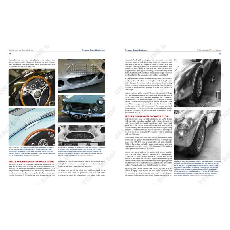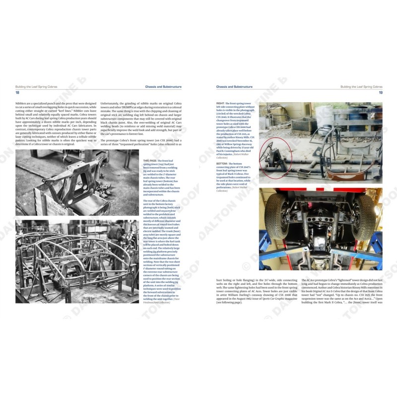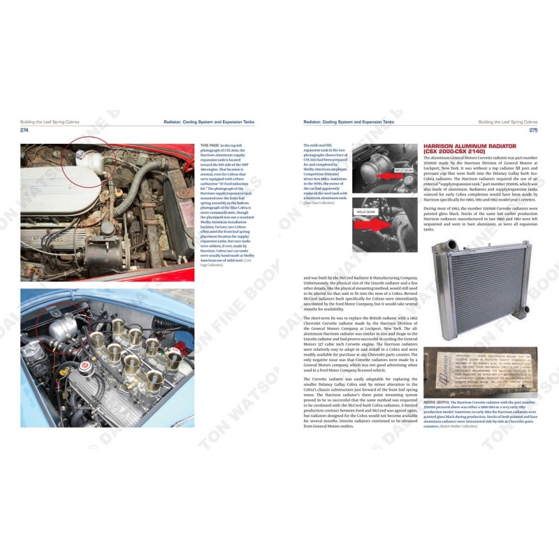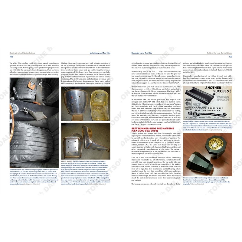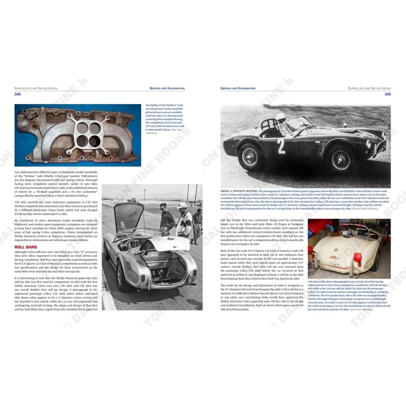 "COBRAS, The Building of the Leaf Spring Cars" is a road map to how the 1962-1964 leaf spring Cobras originated and were put together by AC Cars in England. The book also details how the cars were completed in the United States by both European Cars in Pittsburgh, Pennsylvania and especially by Shelby American in Venice, California. The thirteen chapters cover all major Cobra components consisting of chassis construction, aluminum body forming, engine development, driveline components, upholstery, and finishing techniques. Each chapter is illustrated with dozens of rare original black-and-white factory photographs and background material, such as component illustrations and parts numbers. The research information that is included in these pages is the product of well over a dozen of the most knowledgeable Cobra researchers, historians and restorers in both the United States and the United Kingdom.